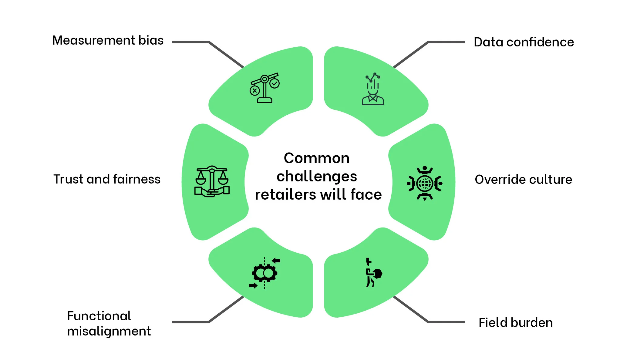 The most common challenges are poor data quality, low trust in model recommendations, too many manual overrides, unclear governance, operational overload in stores, and weak cross-functional alignment.