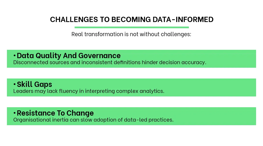 In contrast to data-driven decisions, which focus on automation based on data alone, data-informed leadership emphasises human judgement guided by insight.