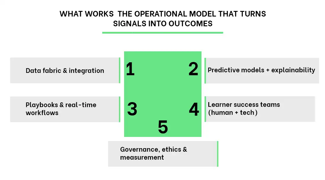 From the case studies and industry best practice (McKinsey/BCG), high-performance learning operations that reduce dropouts share five components: